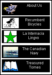 This website and it's associated links are a collection of pages and sites which we find interesting. Included are links about recumbent bicycles, la internacia lingvo de Esperanto, Canadian Navy, and Treasured Tomes (a book search service). Please feel free to comment on the content, or make suggestions, at the mail link below. Thank-you for visiting, and come again. |